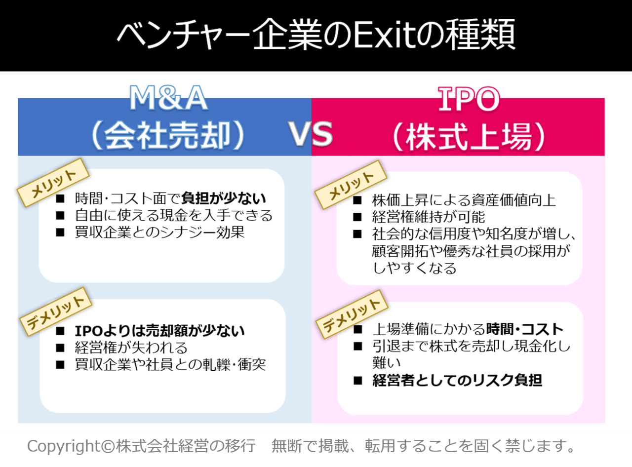 メリット・デメリットを比較検討し、経営者としての適性や会社の特徴(業種、業界の中の立ち位置など)を勘案して目指すべきExit戦略を考えるべきだと思います。