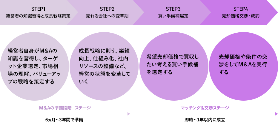 半年間~の準備段階ステージを経て、売却ステージへ移行できれば、あなたの理想のM&Aに近づけることが可能です。