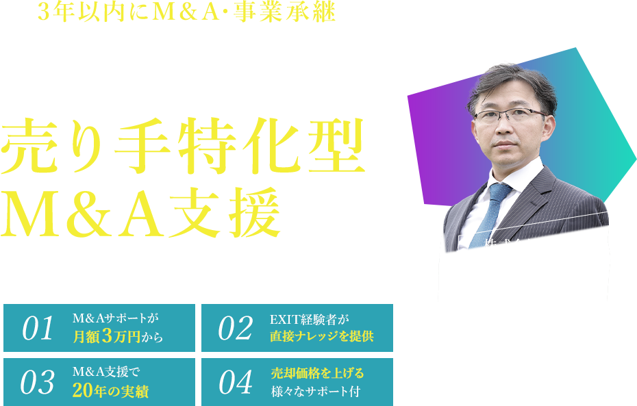 年間の経営を得て自身の会社を2020年にM&Aにて希望価格の2倍の価格で上場企業に売却。20年に及ぶM&A支援実績と自身もEXITを経験する稀有な経歴を持つ。